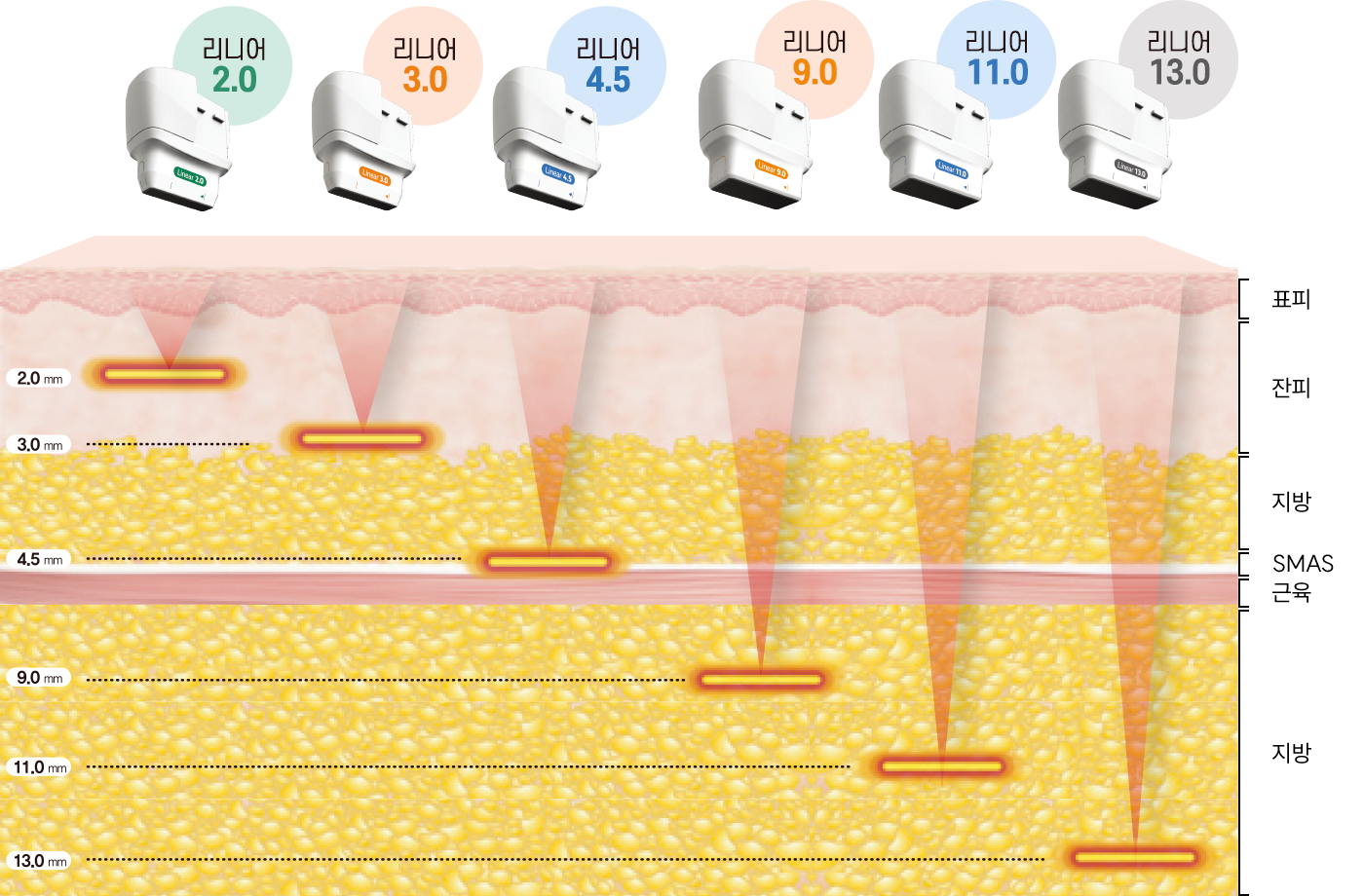 리니어펌은 진피 상층부터 근막층(SMAS)까지 다양한 피부 깊이를 커버하며, 7종류 또는 그 이상의 폭넓은 카트리지 라인업을 사용합니다. 이를 통해 환자 개개인의 피부 상태에 맞춘 섬세하고 맞춤형 시술이 가능합니다.